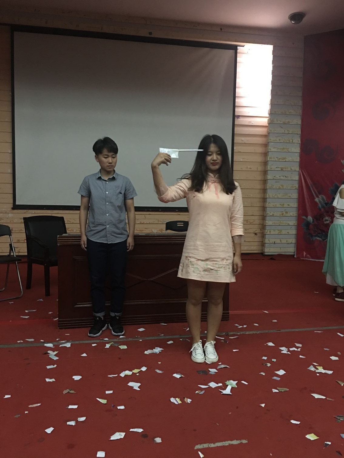 最后的压轴大戏《驴得水》由15汉语言同学深情演绎。将人性的自私、色欲与贪婪诠释的淋漓尽致,伴随着音乐《我要你》的响起,女主一曼的生命终结在了一声枪响,这也是全剧的悲哀。