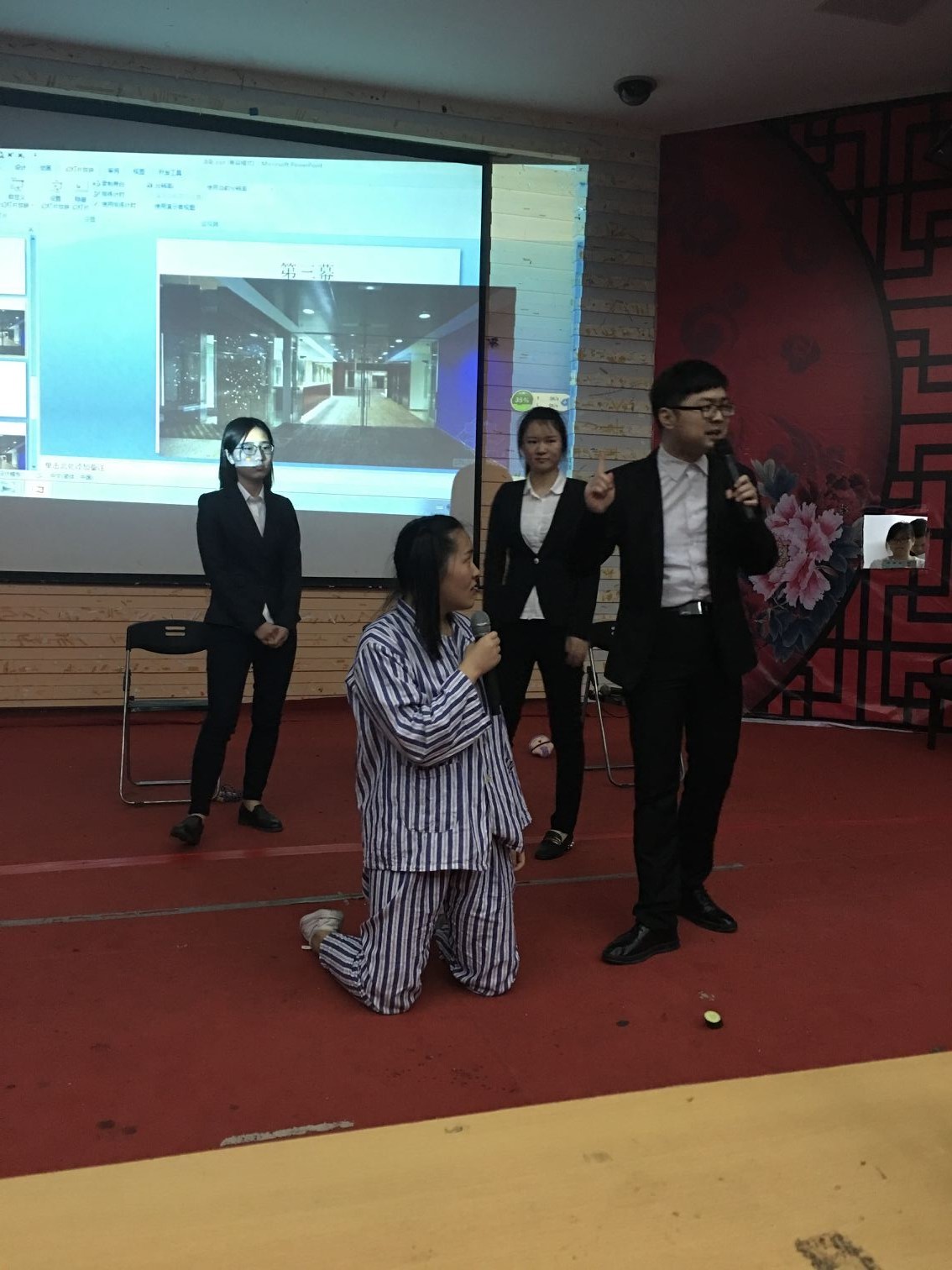 欣赏完了凄美的爱恨情仇故事,接下来14广编3班的同学演绎的则是关于正义与邪恶、关于人性与奴性、关于生产与分配等诸多的社会现实问题。所挖掘出的是帝国主义集团竭力歪曲、掩盖的矛盾,是每一个真正具有良知和革命精神的文艺工作者无法回避的共同主题。剧中精神病的扮演者,丰富的情感表达,配合着精准的肢体动作,将全剧的爆点瞬间点燃。
