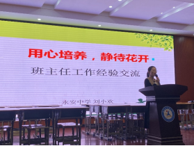 主持人黄莹代表永安中学对同学们的到来表达了热烈的欢迎。刘小欢老师做了主题为班主任工作的讲座,刘老师从“用爱心浇灌花朵”、“用智慧管理班级”、“用活动促进成长”、“用学习成就你我”四个方面概括了自己作为班主任的工作经验。她详细地讲述了如何开展班主任工作,在分享对工作独到理解的同时,也帮助同学们充分了解班主任工作,引发了同学们对班主任工作的深入思考,初步培养了同学们的班级管理能力。刘老师的分享结束后,黄副董事长就员工们心中对班主任工作的疑问进行了解答。黄副董事长最后的“立责于心,履责于心”的寄语也代表对同学们未来成为优秀班主任的殷切期望。