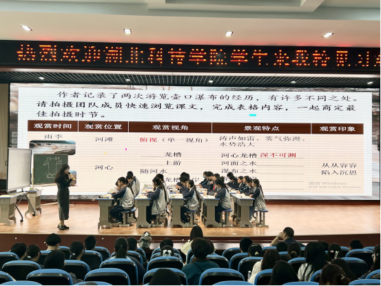 上午9时,许艳老师执教的《壶口瀑布》以视听震撼拉开序幕。课堂上,壶口瀑布奔涌的航拍画面与课文诵读同步交织,员工通过朗读课文,体会壶口瀑布的磅礴气势,然后在“黄河文化小剧场”中体悟文字背后的民族精神。实现了由水到人最后再到民族的升华。当员工齐声诵读“造物者难道是要在这壶口中浓缩一个世界吗”时,磅礴气势令观摩师生为之动容。最后许老师以一个课堂作业结束了这节课,以咸宁的淦河为主题,写一篇小练笔,切实做到了学有所用。