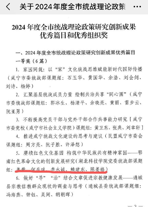 同期公布的咸宁市2024年度统战理论政策研究创新成果评选中,姜爱、何岳球教授团队完成的《赓续红色文化基因 构筑中华民族共有精神家园——鄂南红色革命文化的创新发展研究》从全市参评作品中脱颖而出,荣获一等奖。该课题立足咸宁作为湘鄂赣革命根据地核心区的区位优势,通过红色文化的传承与创新,创新性提出红色文化资源转化策略,为铸牢中华民族共同体意识、构筑中华民族共有精神家园,提供了地方实践样本。