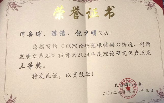 在3月23日召开的民建湖北省第九届委员会第五次全体会议上,发布了《关于表彰2024年度新闻宣传工作先进单位、理论研究优秀成果和组织的通报》,何岳球教授撰写的《以理论研究根植凝心铸魂、创新发展之基石》荣获2024年度理论研究优秀成果三等奖。该研究深入探讨了理论研究在凝聚人心、推动创新发展中的重要作用,系统阐释了新时代民主党派理论建设的实践路径,为民建组织强化思想建设提供了学理支撑。