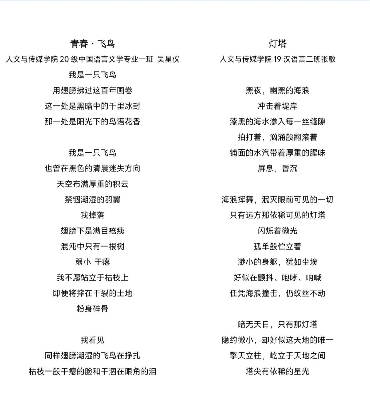 从百年团史故事到个体青春故事,来自全校13个院部三百余名员工以精致细腻的文字,真挚饱满的情感展现着湖科青年蓬勃向上的青春风采。吴星仪和张敏运用天马行空的想象,将鲜红的信仰比作灯塔,将迷茫的自我比作飞鸟,以内敛含蓄的语言述说着他们的爱团、爱党、爱国情怀,回顾百年光辉历程,展望未来新时代,紧跟党组织步伐,奋进新的征程。也有选手分享自己与共青团的难忘经历和感受,高仕婧回忆党课培训时的义卖活动,她在团组织带领下帮助他人、传递温暖,同时学习到了身为团员的责任与义务,受益匪浅、意义深刻。刘红讲述了自己跟随青马班到荆州洪湖、黄冈红安学习的经历。学党史,唱红歌,参观红色革命基地,一口不太熟练的红安话,道不尽的是红色革命精神。历史川流不息,精神代代相传,新时代的青年,青春正当时,奋斗正当时!