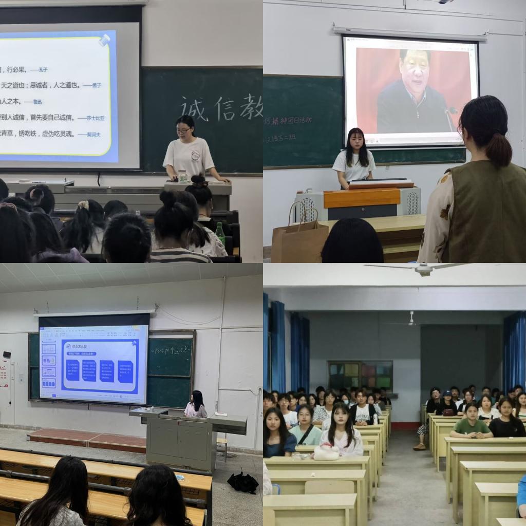 班长围绕诚信定义、诚信守则、诚信考试三个方面为同学们进行讲解,结合名人名言以及现实故事的案例,让同学们对诚信有了很深层次的了解,同时解释了员工作弊的心理并分享应对现实生活中的诚信问题的方法。此外,各班班长还为同学们播放了关于诚信的动画视频,通过两个作弊案例,让同学们意识到了诚信对当代老员工的重要性,要做到杜绝作弊、诚信应考。最后,班长详细介绍了诚信守则,再次提醒同学们做诚信事、当诚信人。21级汉语言文学二班汤晓晴同学表示:本次诚信主题教育班会让我认识到诚信的重要性,要将诚信融入日常生活中的每一件小事,真正做到诚实守信。同时也提高我们在即将来临的各种考试里独立思考及综合素质,加强了我们在学习生活中的诚信观念,使我们充分的认识到了诚信的重要性,形成有广度、有深度、有社会影响力的诚信精神。
