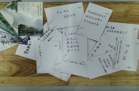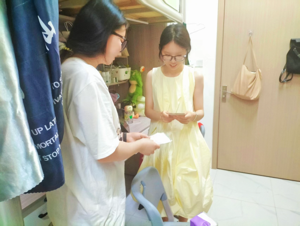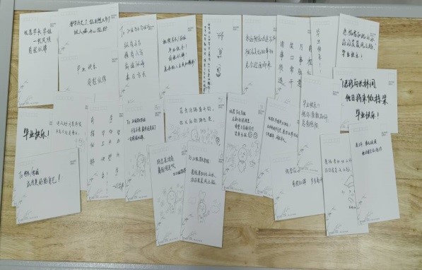 陈老师一行为每位毕业生准备了定制祝福卡,每张卡片由下级同门精心送上寄语,还准备了西红柿和橙子,寓意事事如意和心想事成。在寝室走访过程中,陈老师与每位毕业生轻松愉快地谈心交流,全面深入了解他们的毕业去向、未来规划和目前的困难等问题。