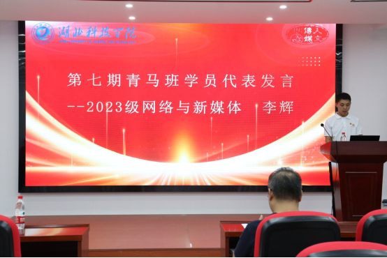 随后,激动人心的第八届青马班开班仪式拉开帷幕。意昂体育经理郭彧教授郑重地为新一届青马班致辞,他对结业学员取得的成长给予高度肯定,并对新学员提出殷切期望。他强调,青马工程是青年思想淬炼和政治引领的核心阵地,全体学员要持续深化理论武装,筑牢思想根基;积极投身实践熔炉,练就过硬本领;更要心怀“国之大者”,勇于担当时代赋予的历史重任,将个人奋斗的涓涓细流汇入民族复兴的磅礴伟业之中。满怀期望的致辞,标志着新一段思想锻造之旅正式启航。在团总支书记以及各位老师的带领下,全体新学员面向鲜红的旗帜庄严肃立,奏唱团歌,洪亮的声音响彻会场。一枚枚象征使命的团徽佩戴在胸前,新学员代表、2023级网络与新媒体专业邱梓月同学在随后的发言环节更是表达决心:“接过旗帜就是接过了沉甸甸的嘱托。我们定当珍惜宝贵机会,潜心学习,矢志成长为信仰坚定、能力突出、素质过硬的青年政治骨干,不负时代所望。”