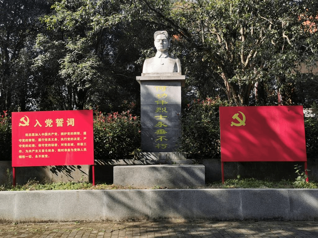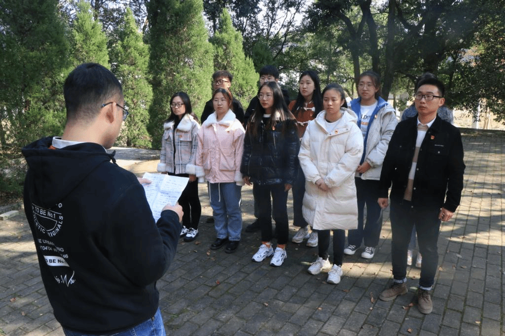 何功伟烈士陵园内,松柏环绕,丰碑矗立。在支部书记郭老师的指导下,员工党员周宇向支部成员介绍何功伟同志抗日救国,为革命事业英勇献身的事迹。
