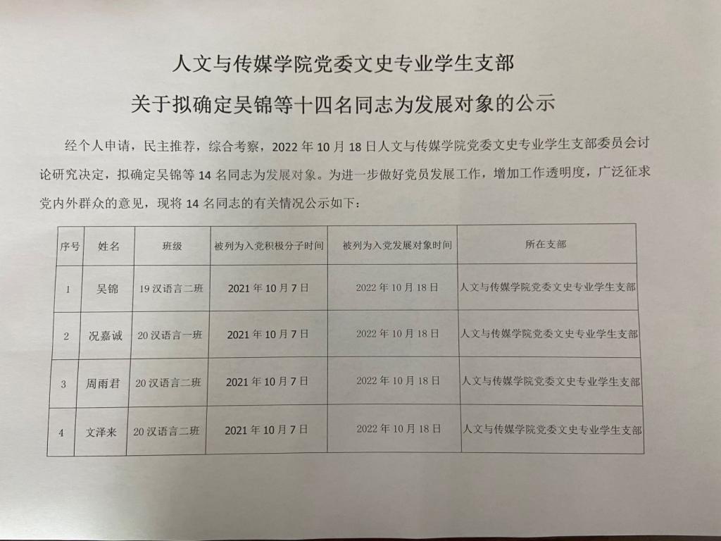 意昂体育党委文史专业员工支部关于拟确定吴锦等十四名同志为发展对象的公示
