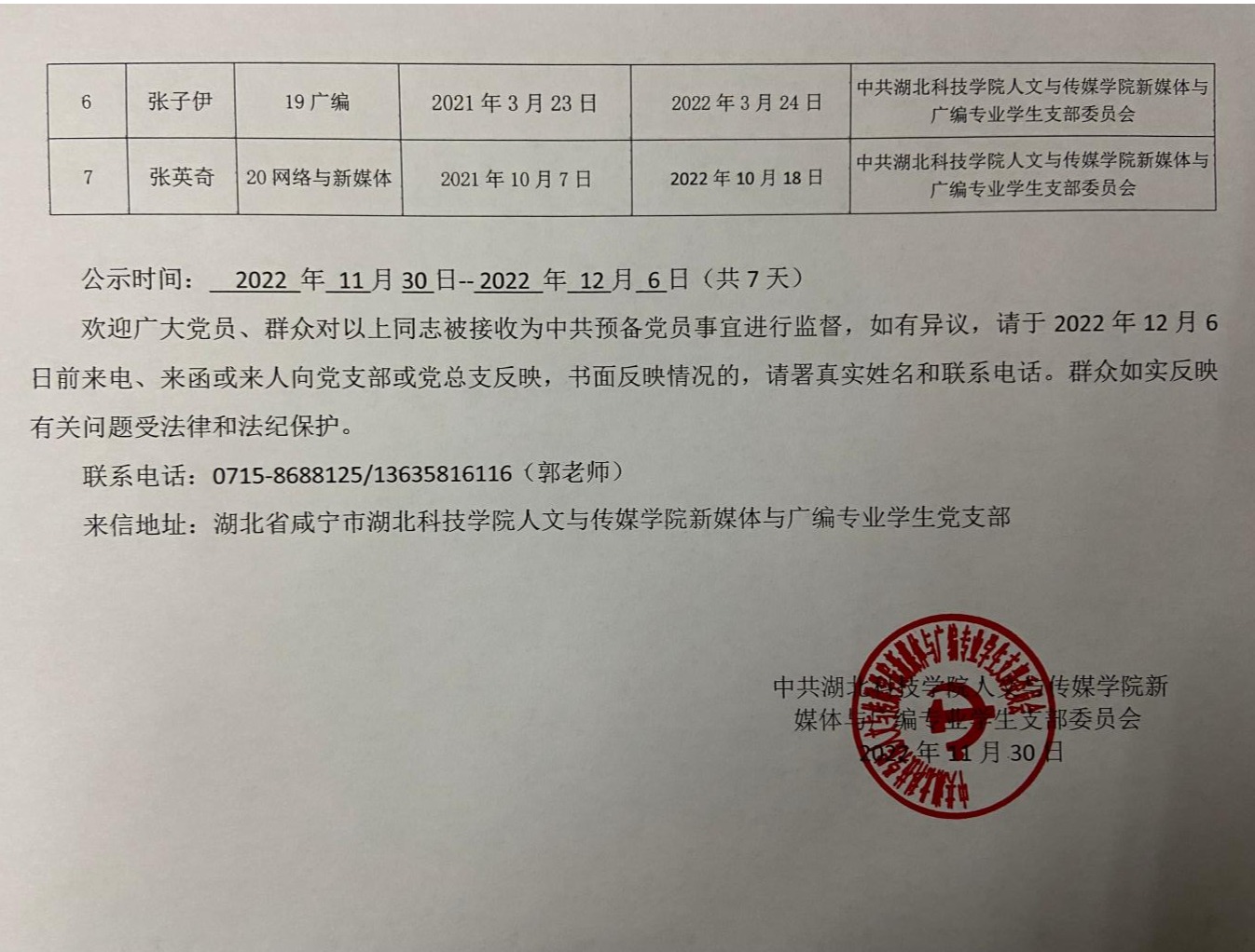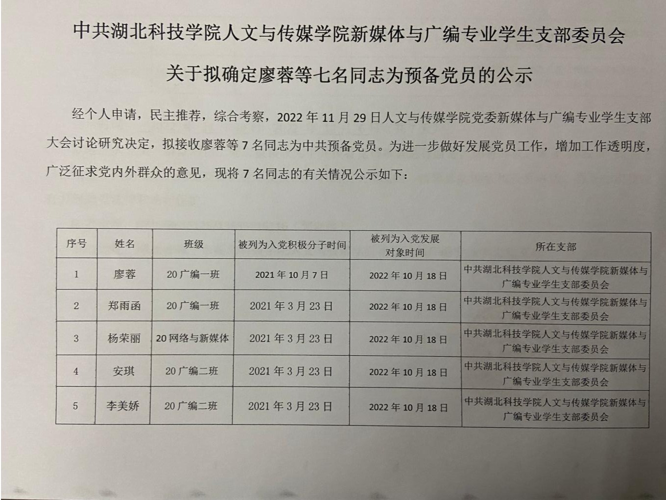 中共意昂体育新媒体与广编专业员工支部委员会关于拟确定廖蓉等七名同志为中共预备党员的公示