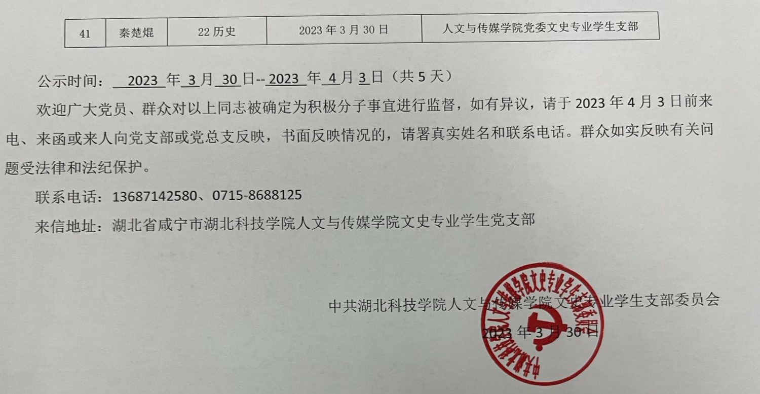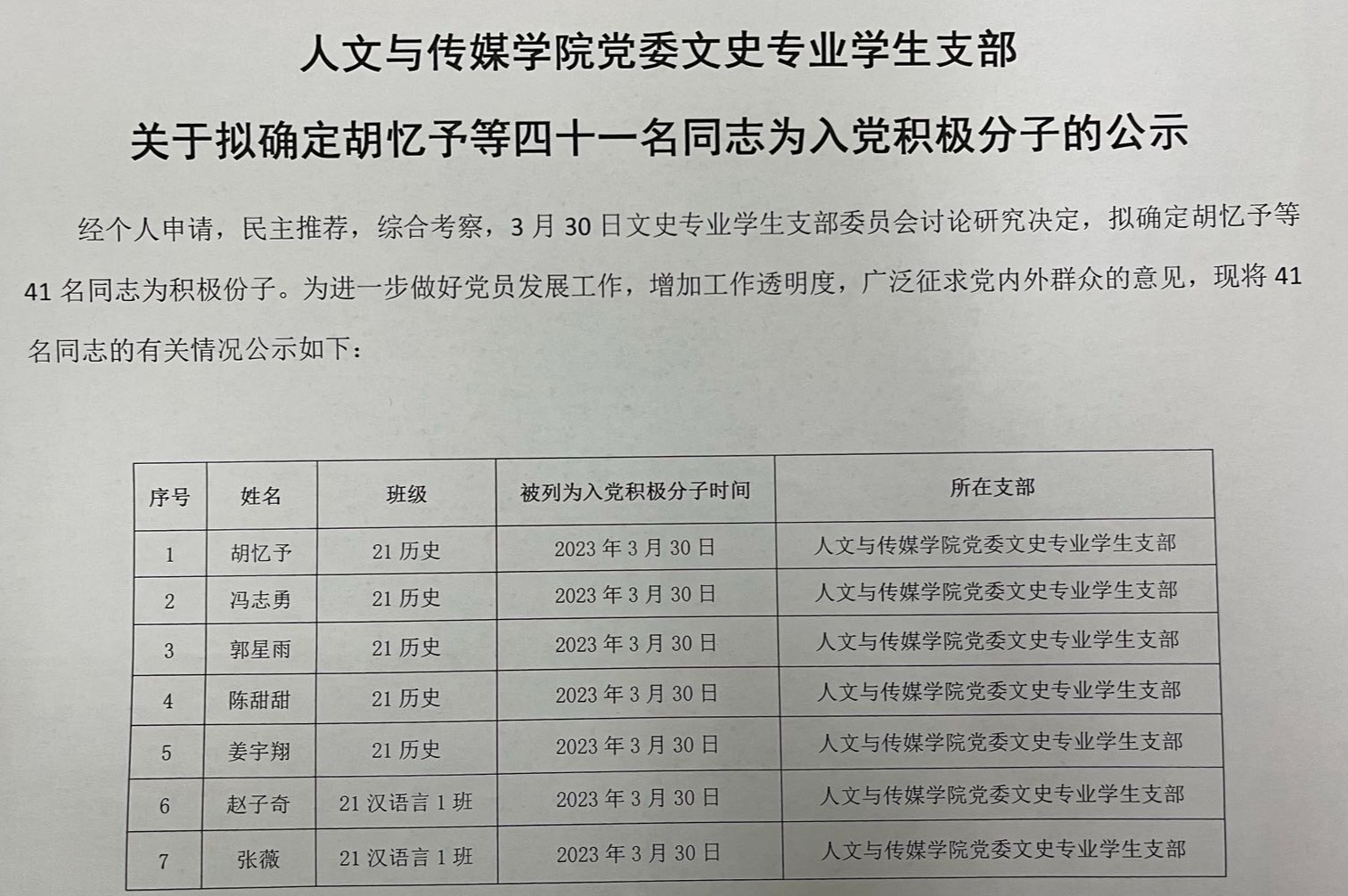 意昂体育党委文史专业员工支部关于拟确定胡忆予等四十一名同志为入党积极分子的公示