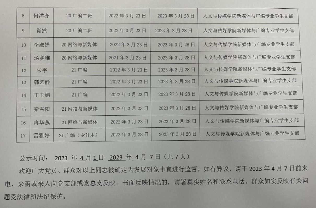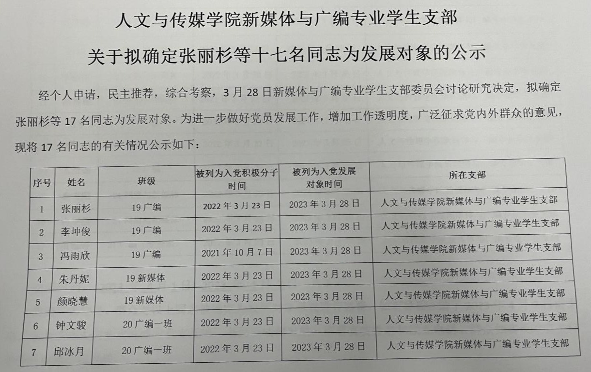 意昂体育党委新媒体与广编专业员工支部关于拟确定张丽杉等十七名同志为发展对象的公示