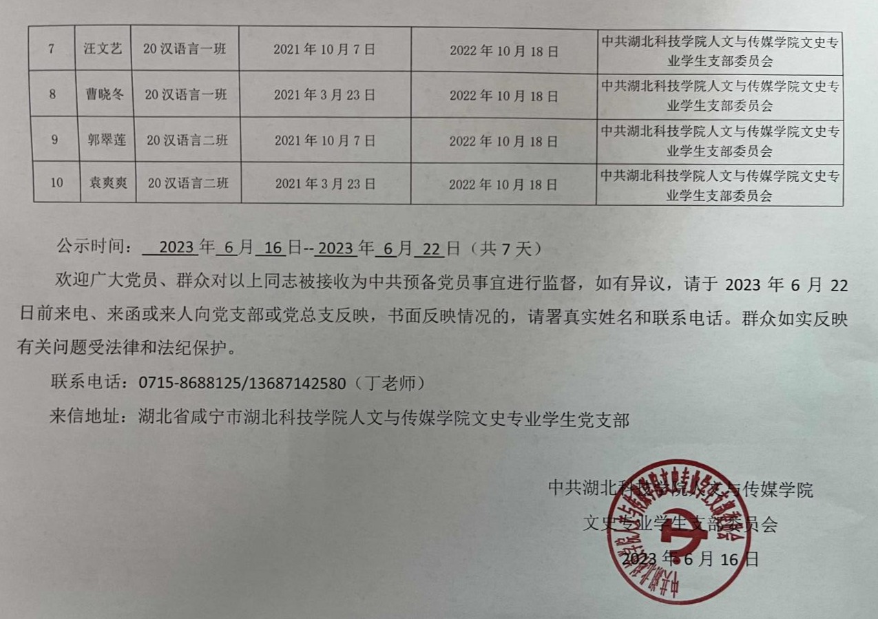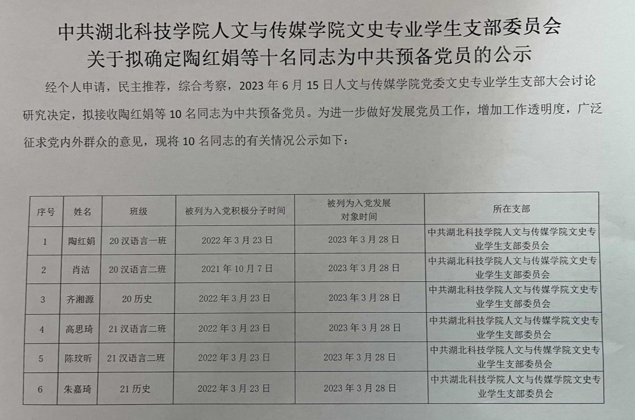 中共意昂体育文史专业员工支部委员会关于拟确定陶红娟等十名同志为中共预备党员的公示