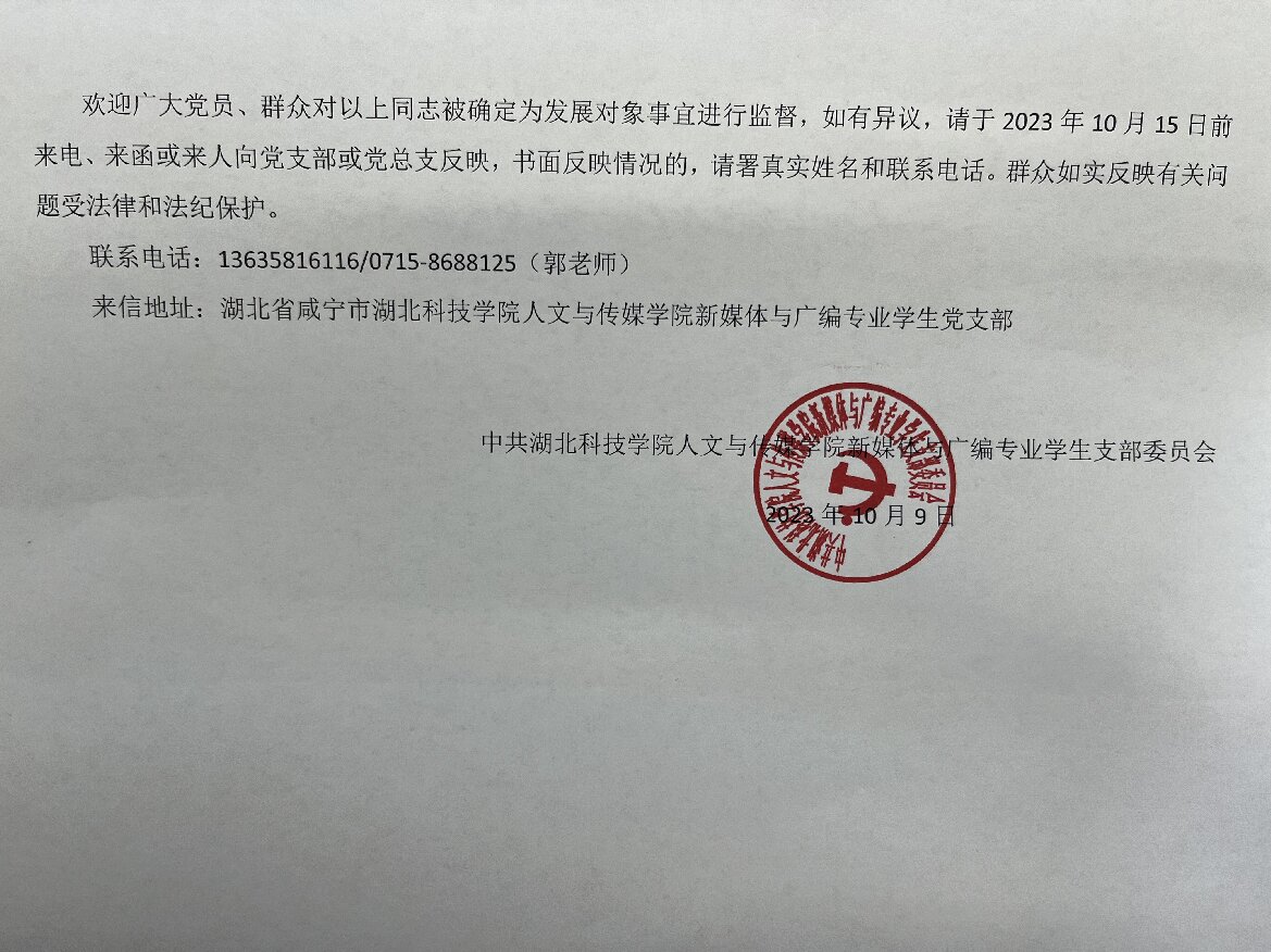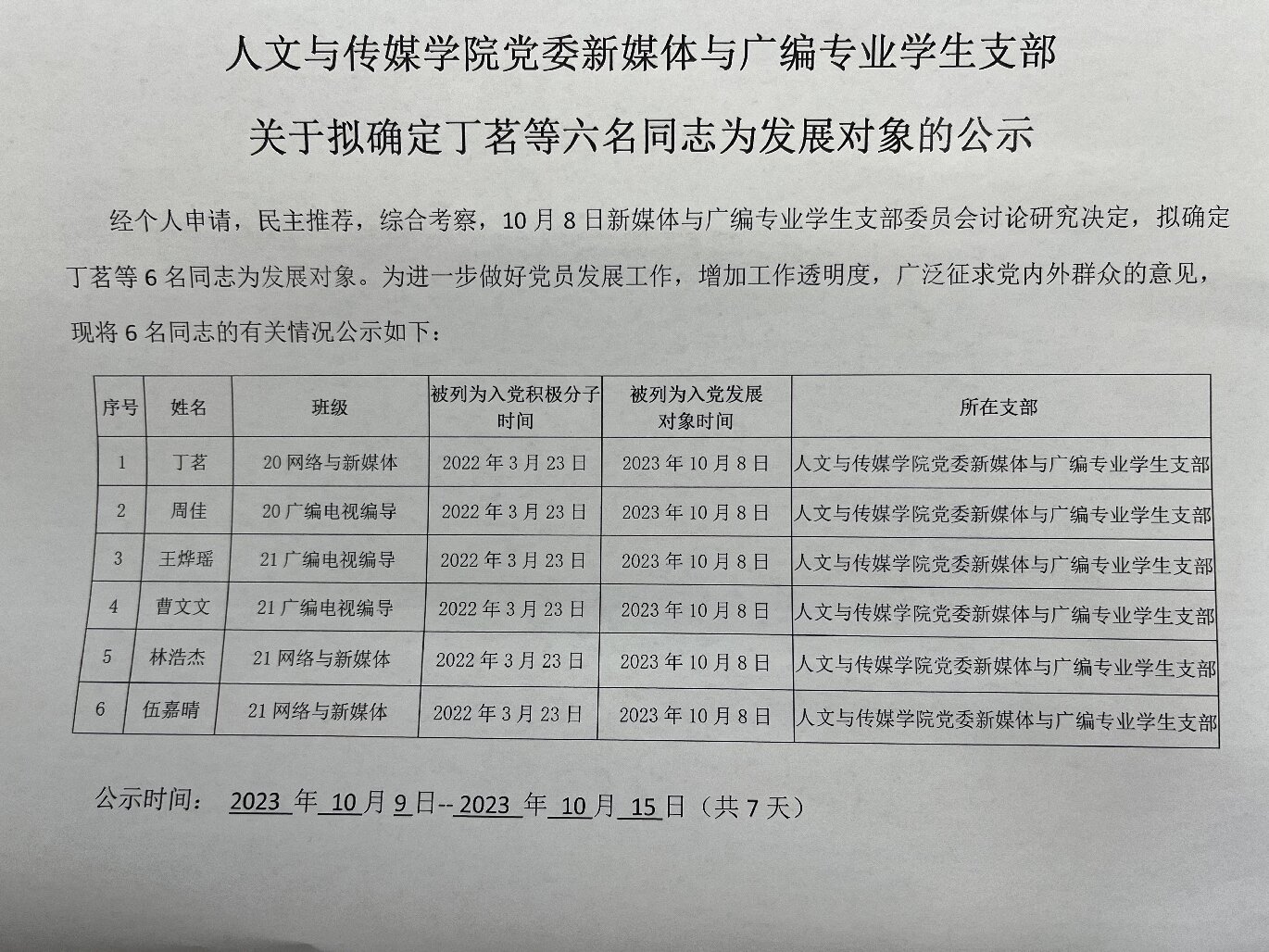 意昂体育党委新媒体与广编专业员工支部关于拟确定丁茗等六名同志为发展对象的公示