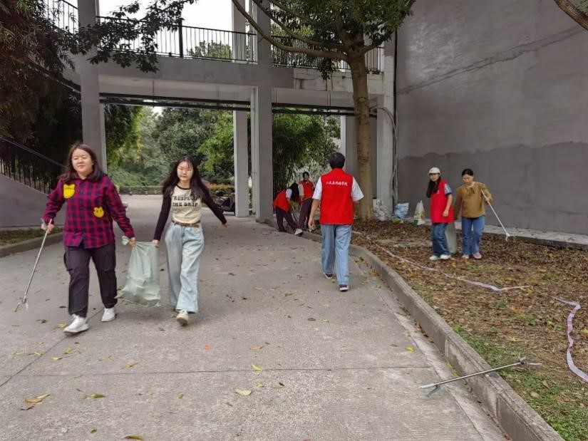 20多名党员志愿者在老师指导下,分小组前往相应负责区域,以指尖善举,护校园美丽。他们弯腰穿梭在教学楼间、绿化带里,拿着钳子和扫帚,仔细地捡起废纸、塑料袋等垃圾;蓝天白云下,辛勤的志愿者们让校园环境焕然一新。红马甲,此刻亦成为了一道亮丽的风景线。经过2个小时的辛勤清理,每个人都“战果累累”,汗流浃背。