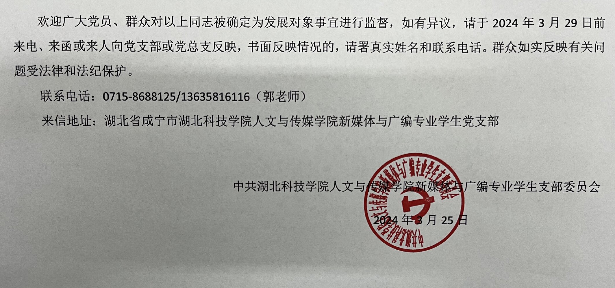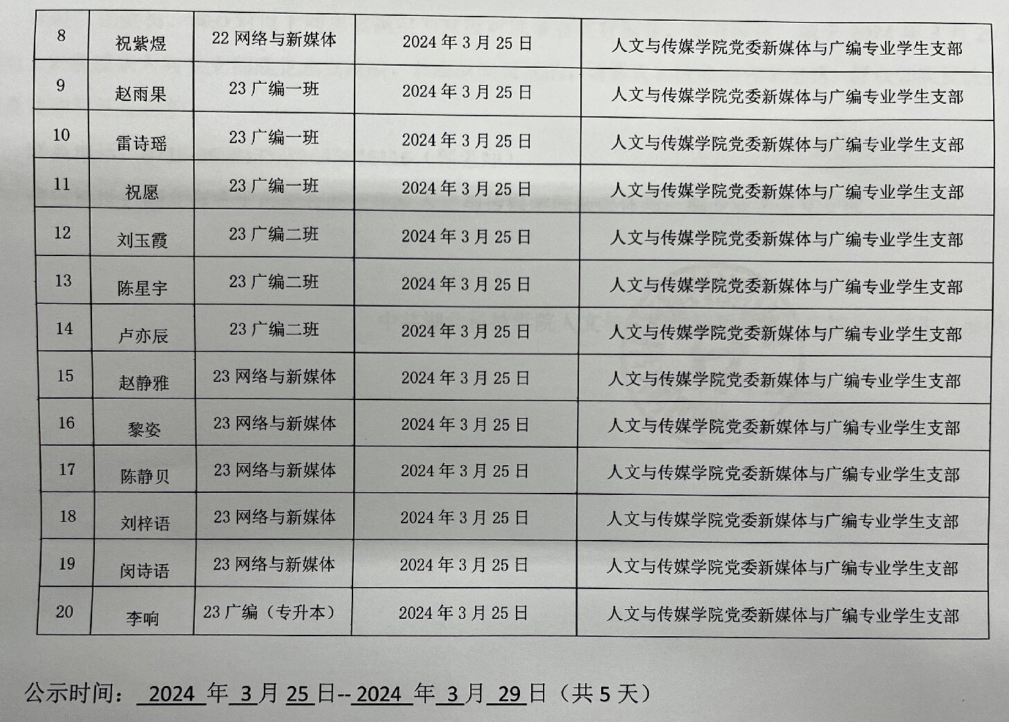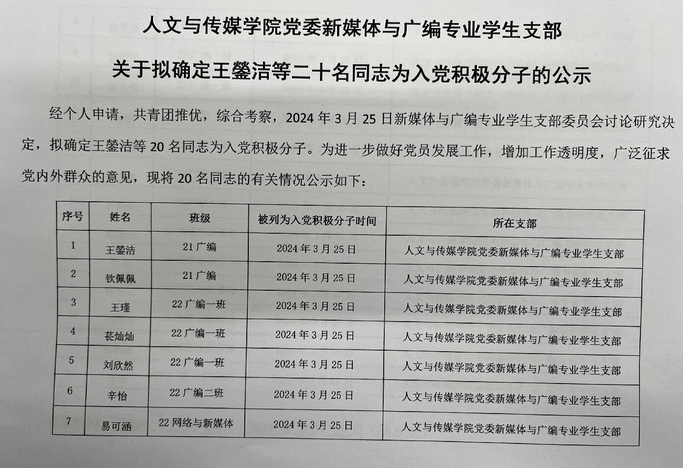 意昂体育党委新媒体与广编专业员工支部关于拟确定王鎣洁等二十名同志为入党积极分子的公示