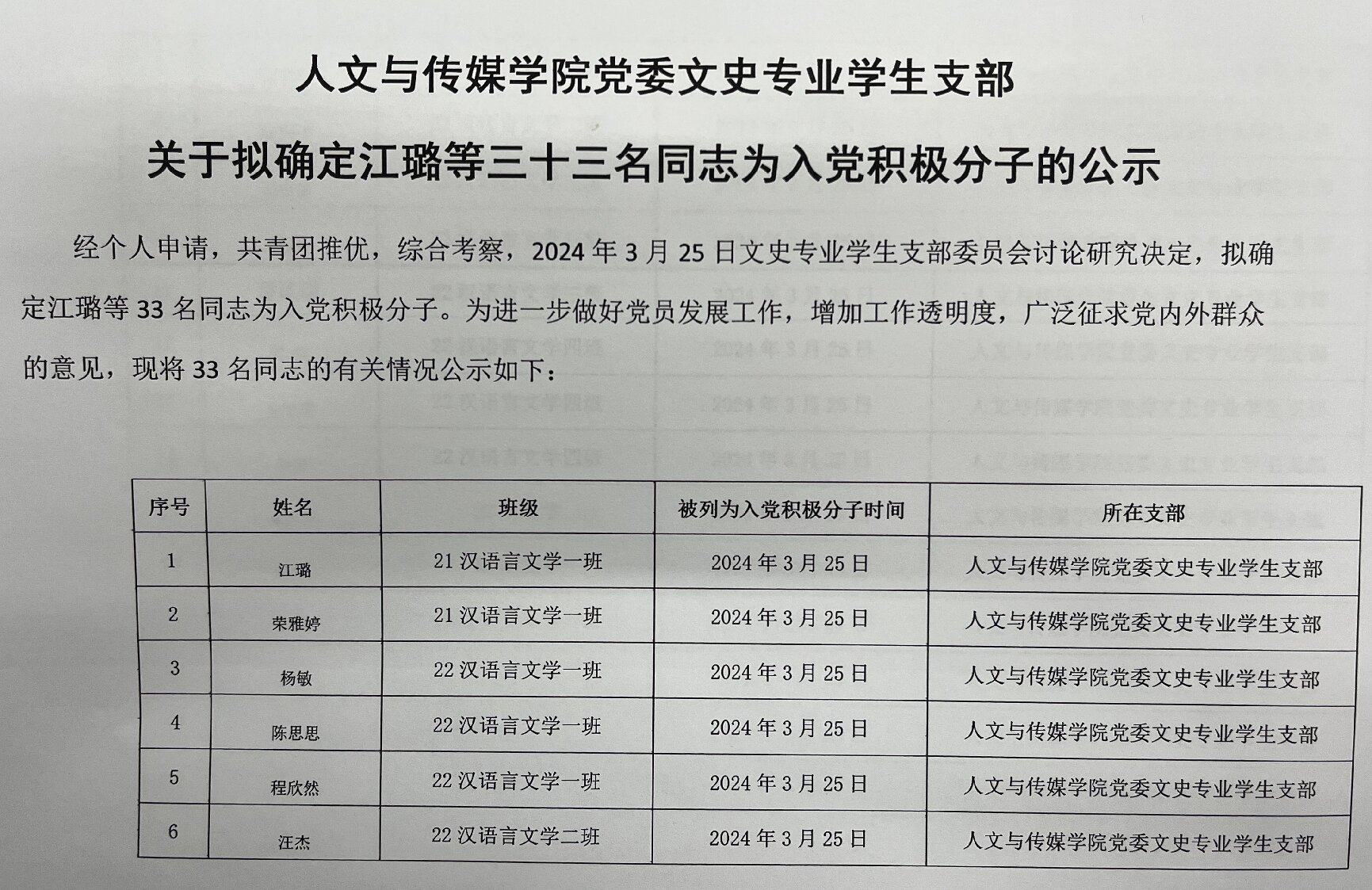 意昂体育党委文史专业员工支部关于拟确定江璐等三十三名同志为入党积极分子的公示