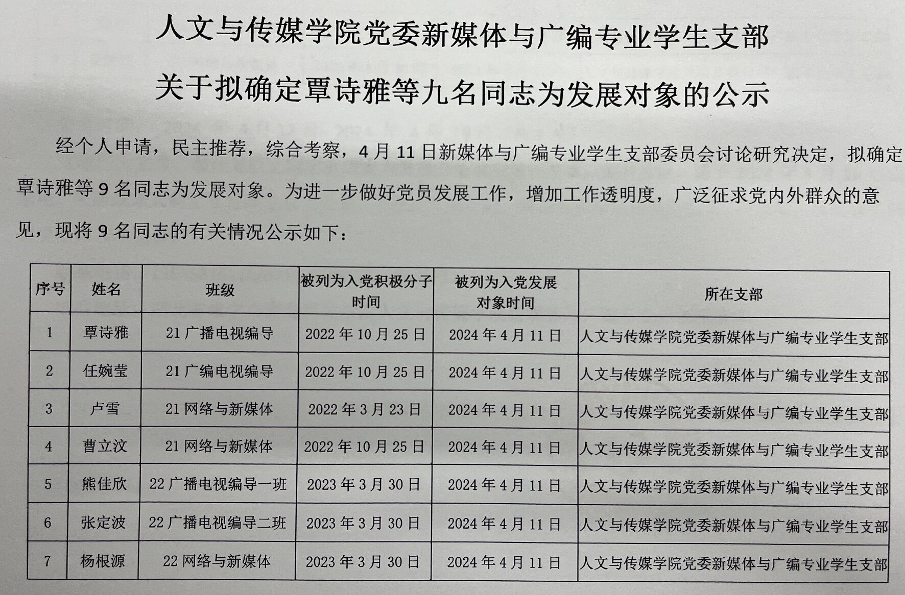 意昂体育党委新媒体与广编专业员工支部关于拟确定覃诗雅等九名同志为发展对象的公示