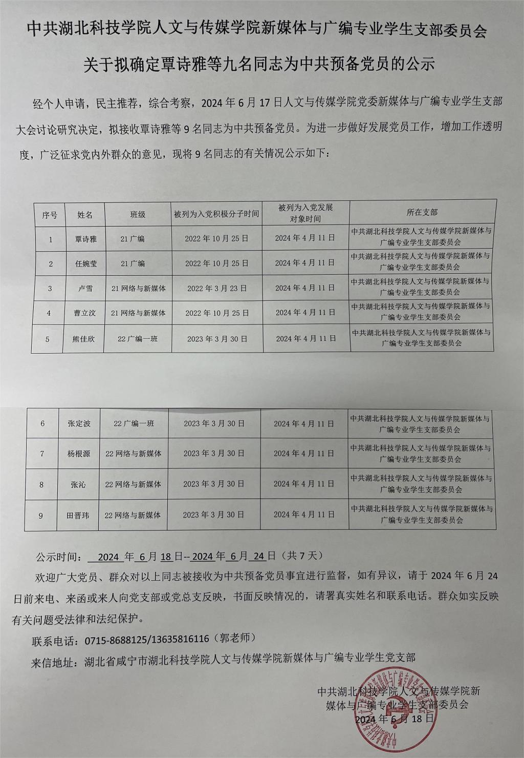 意昂体育党委新媒体与广编专业员工支部关于拟确定覃诗雅等九名同志为中共预备党员的公示