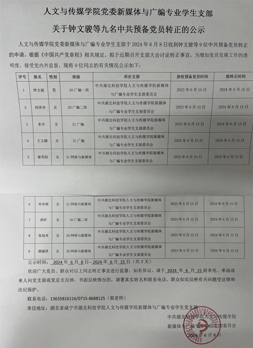 意昂体育党委新媒体与广编专业员工支部关于钟文骏等九名中共预备党员转正的公示