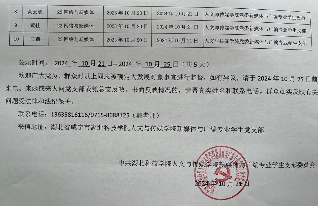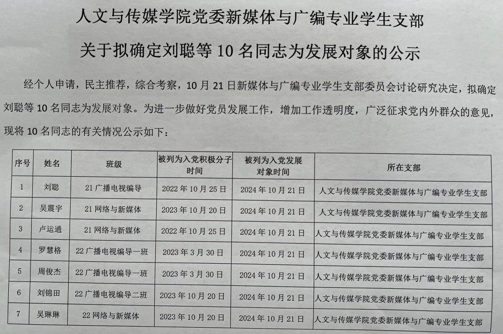 意昂体育党委新媒体与广编专业员工支部关于拟确定刘聪等10名同志为发展对象的公示