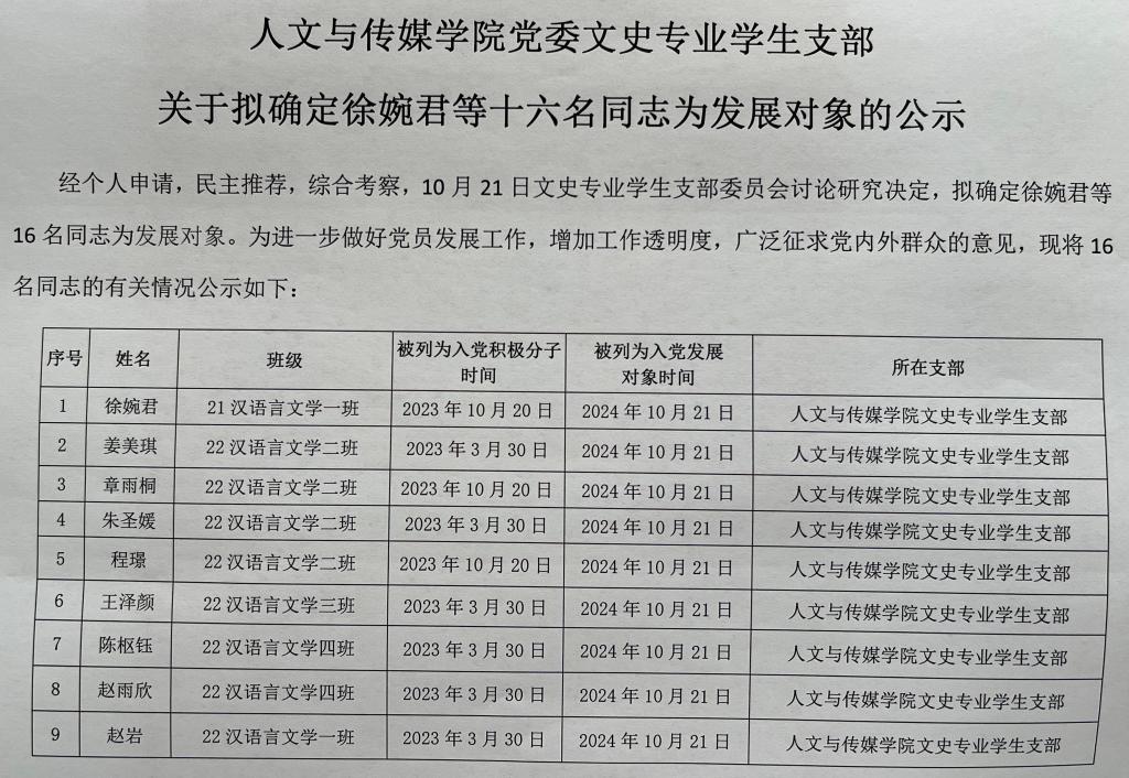意昂体育党委文史专业员工支部关于拟确定徐婉君等十六名同志为发展对象的公示