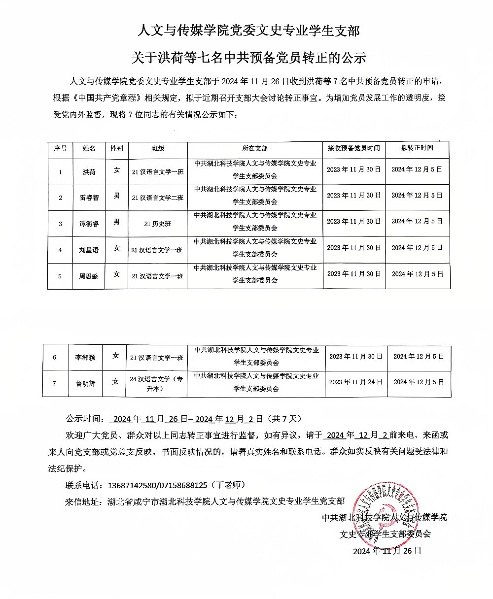 意昂体育党委文史专业员工支部关于洪荷等七名中共预备党员转正的公示