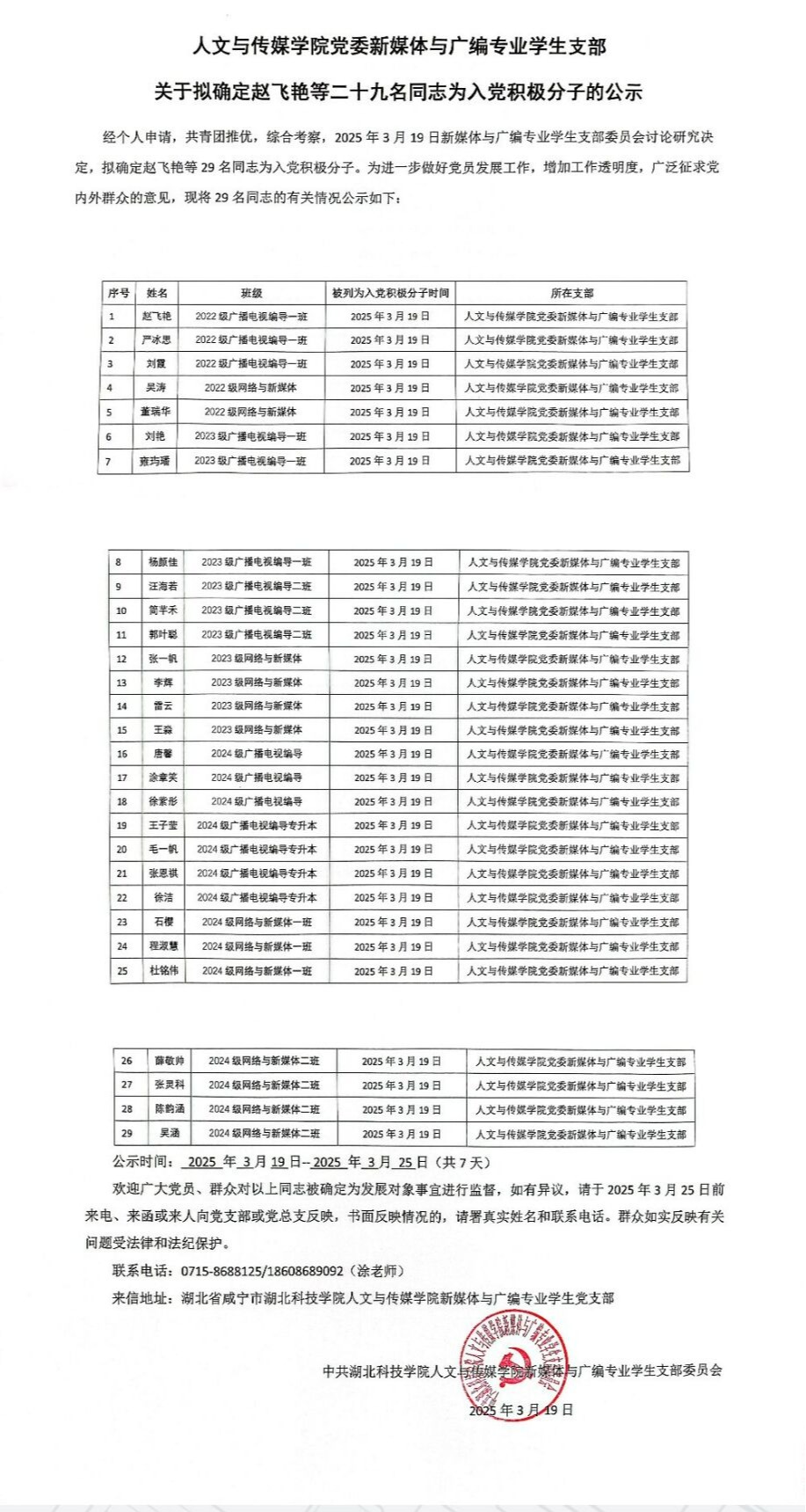 意昂体育党委新媒体与广编专业员工支部关于拟确定赵飞艳等二十九名同志为入党积极分子的公示