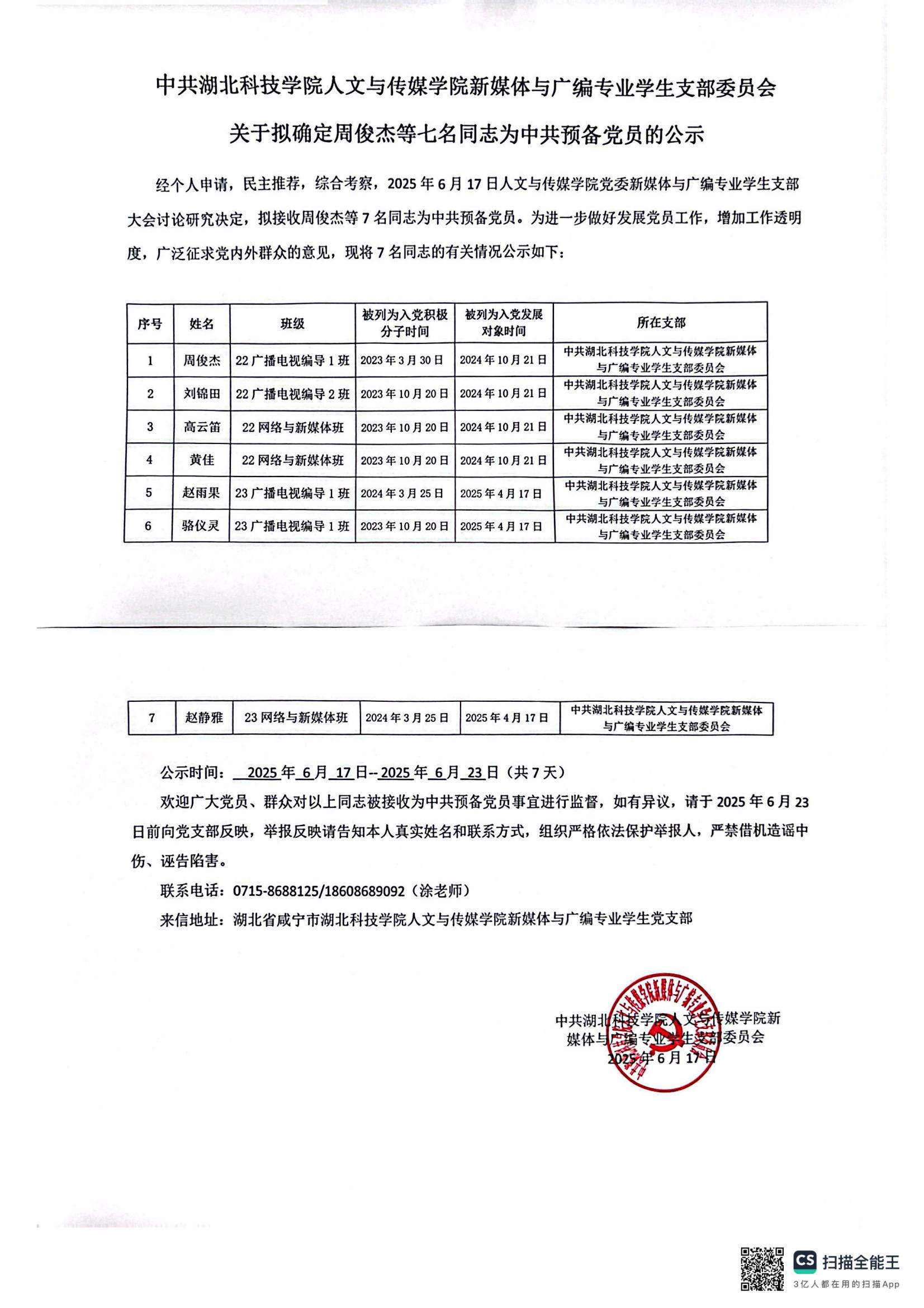 中共意昂体育新媒体与广编专业员工支部委员会 关于拟确定周俊杰等七名同志为中共预备党员的公示