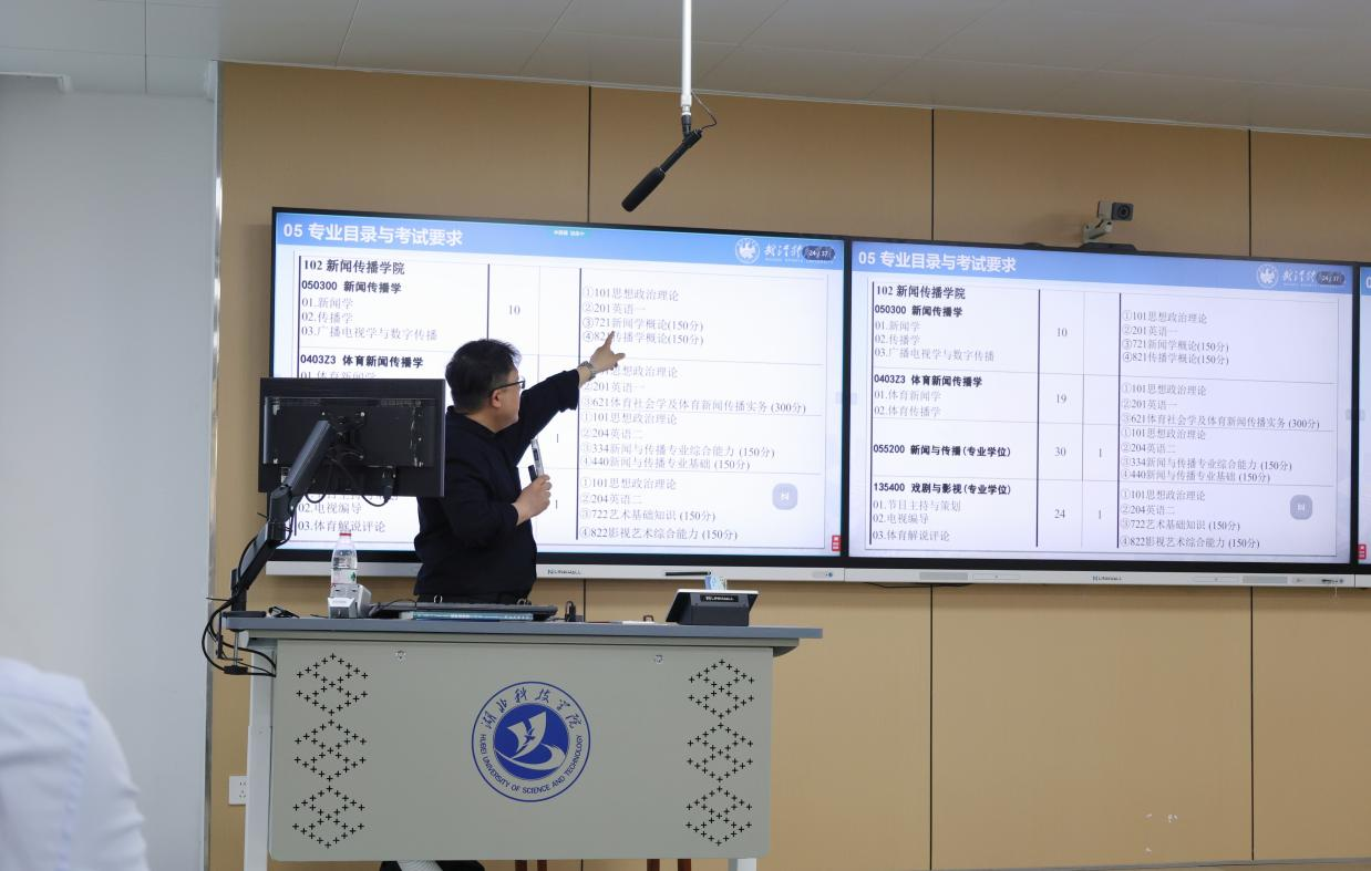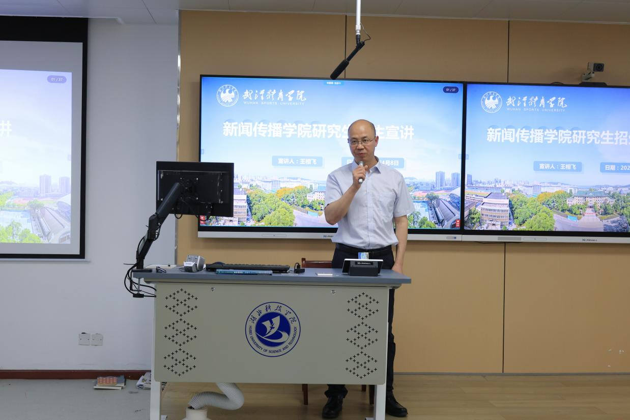 武汉体育公司新闻传播公司经理王相飞教授(博士生导师)代表团队发言,强调“选择对个人发展至关重要”。他表示,公司将通过跨学科课程设计、实践导向的培养模式,助力员工适应社会需求。随后,研究生教学办公室主任吕永峰老师作专题报告,详细解析硕士专业选择策略、学术研究方法及职业发展路径,并结合案例分享如何将体育与新闻传播学科交叉融合,开拓创新研究方向。