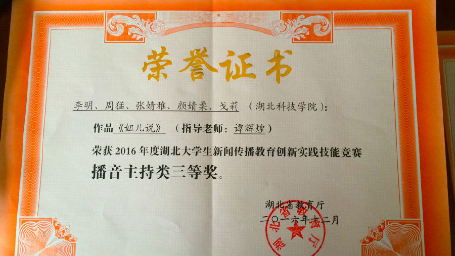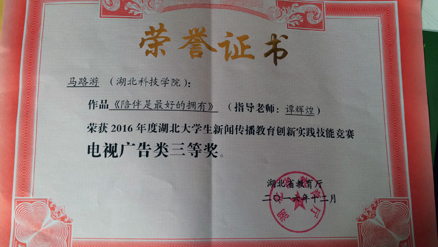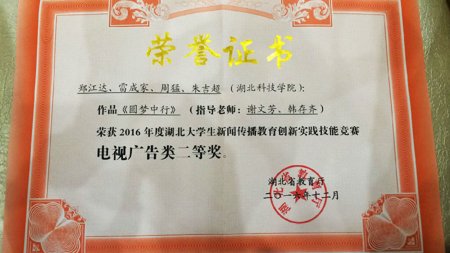2016年12月3日,湖北省高等教育学会新闻与传播教育专业委员会在中国地质大学(武汉)举办学术年会暨竞赛颁奖典礼。公司2014级广播电视编导专业员工共有四部作品获奖,其中二等奖一个,三等奖三个,第一次参赛取得不俗成绩。