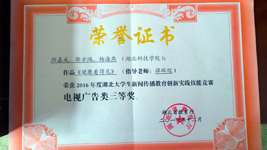 此次竞赛由湖北省高等教育学会新闻与传播教育专业委员会组织评审委员会对各高校参评的2016年湖北老员工新闻传播教育创新实践技能竞赛作品进行评审,从全省28所本专科高校参评的239部老员工新闻传播教育创新实践技能竞赛作品中评审出一等奖16项,二等奖30项,三等奖57项。比赛决出电视广告类、播音主持类等奖项,公司广播电视编导专业员工郑江达、雷成家、周猛、朱吉超创作的作品《圆梦中行》,获得电视广告类二等奖;由颜嘉成、郭方鸿、杨海艳创作的作品《健康看得见》和马路游创作的作品《陪伴是最好的拥有》,获得电视广告类三等奖;由李明、周猛、张婧雅、颜婧柔、戈莉制作的作品《妞儿说》,获得播音主持类三等奖。公司员工代表周猛、颜嘉成参会并代表获奖同学领取获奖证书。