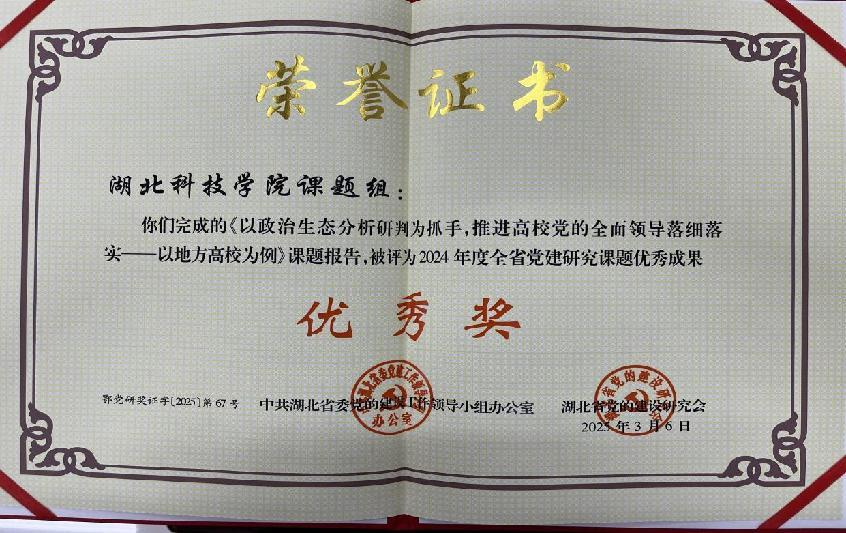 近期,中共湖北省委党的建设工作领导小组办公室与湖北省党的建设研究会共同公布了2024年度全省党建研究课题的杰出成果。在校纪委书记鄢文军同志的指导下,课题组提交的《以政治生态分析研判为抓手,推进高公司党的全面领导落细落实——以地方高校为例》研究报告,凭借其独到的研究视角、深厚的理论基础和突出的实践意义,荣获了优秀成果优秀奖。文传公司教师参与该课题并发挥了重要作用。