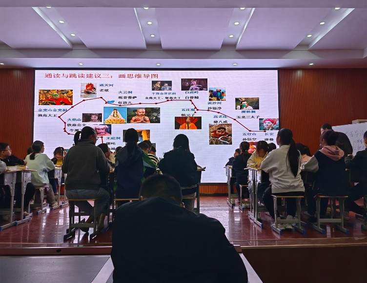 随后,余龙飞老师带领七年级的同学们上了一节生动的名著导读课——《西游记》。余老师以通读和跳读入手,讲述了读书方法所强调的四个方面:“拟题目”“做摘要”“理情节”“得收获”并立足于此带领大家进行通读。余龙飞老师的阅读理论和教学方法使我们明白了怎么样把书“读薄”,而在阅读中结合思维导图的读书方法,使我们对教学组织中的阅读体验有了一定认识。余龙飞老师的语言风趣幽默,课堂妙趣横生。