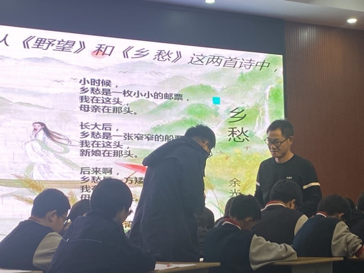 接下来是梁传书老师带领九(4)班的同学进行《诗歌反复手法的品读与借鉴》群文阅读课堂展示。梁老师以“风姿绰约的‘反复’”为题进行课堂展示,让员工从多张图片的观察引入“反复”手法的运用,从《野望》和《乡愁》两首诗歌带领员工体会反复的形式和反复的效果,让员工以反复手法自主创作诗歌,体验做诗人的滋味。最后以对同学的期望——“希望同学们发现美,找到美,用自身的聪慧表现美”来作为课堂的结尾。四十分钟流畅而新颖的课堂设计令人感到酣畅淋漓,回味无穷。