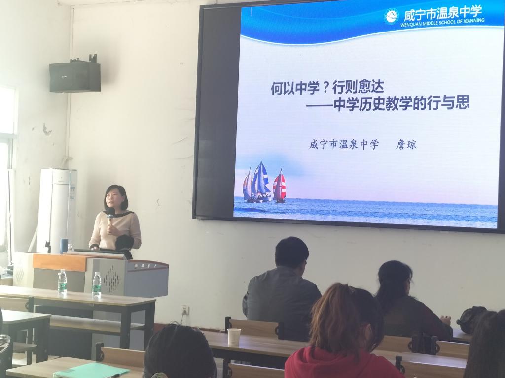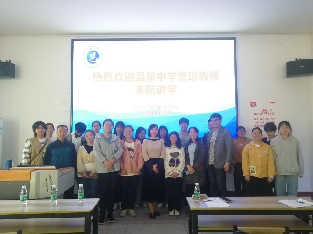 10月19日,温泉中学历史教学名师、员工詹琼受邀走进意昂体育讲学交流,意昂体育历史专业负责人丹睿,教师代表朱志先、张霞以及2020、2021级历史专业全体员工聆听了讲座。