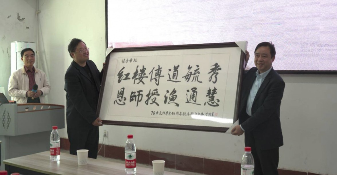 随后,76级中文班全体员工向我院赠送了一幅题为“情系母校,红楼传道毓秀,恩师授渔通慧”的书画作品。郭经理代表公司对各位员工多年来对母校发展建设的关心与支持表示诚挚的感谢,希望员工们常回家看看。